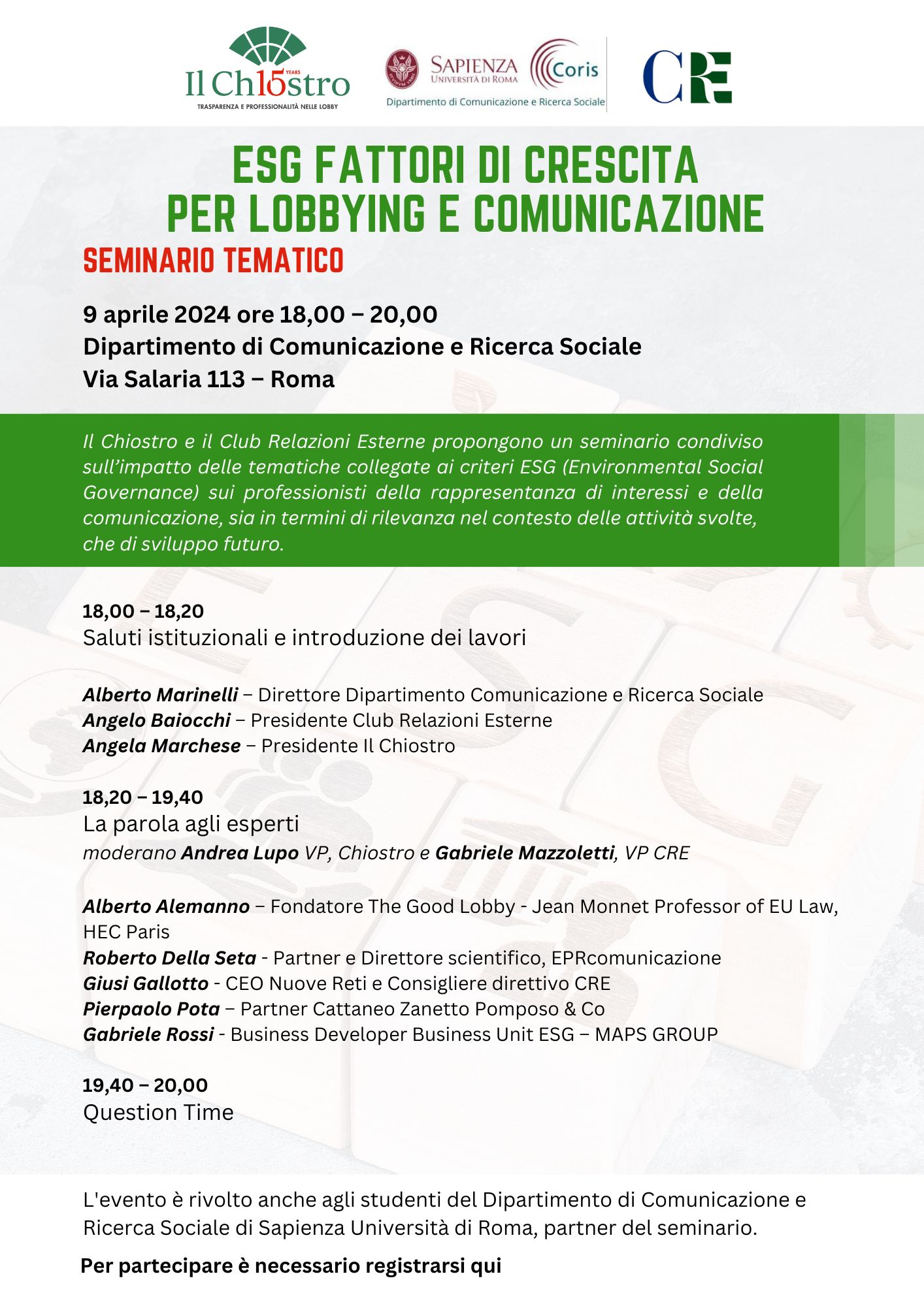 Il Chiostro and the Club Relazioni Esterne propose a shared seminar on the impact of issues related to ESG (Environmental Social Governance) criteria on interest representation and communication professionals, both in terms of relevance in the context of the activities carried out and future development .